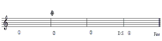 解説:答えは、「?、?、?、?、?、?」です。 「ダル・セーニョ」から「セーニョ」へ飛び、 「Fine(フィーネ)」で終わります。